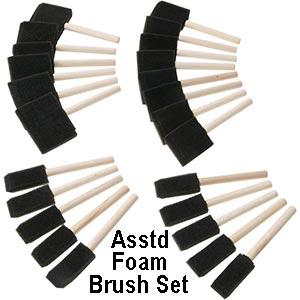 Assorted Foam Brush Set (24 pcs) - These disposable foam brushes are just what the doctor ordered for water-and-oil based paints and finishes. Made with a wooden handle and a tough plastic support panel. Ideal for use with stains, varnish and urethane finishes. Includes ten 1", eight 2" and six 3" sizes