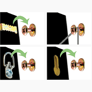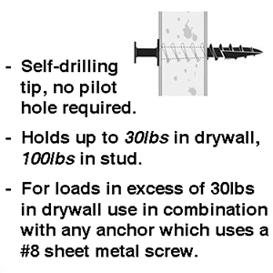 The Bear Claw Hangers include the double-headed, anchorless screw that works best with D-rings or wire for simple mirror and mirror and picture hanging solutions. Installs with a hand-held phillips screwdriver. No pilot hole required because it has a self-drilling tip for easy installation in dry wall, lath plaster or wood studs. When used with these products the Bear Claw Hanger is hidden from view. Works with plastic anchors if additional holding power is needed. Threaded length is 1" long.