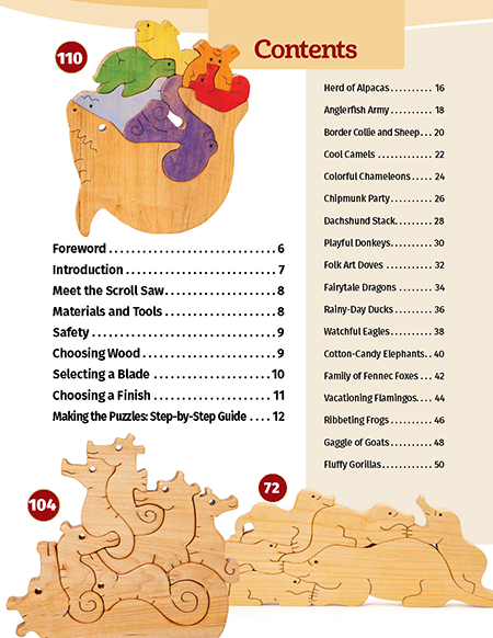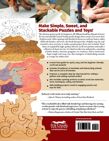 Achieve simple, sweet, and stackable puzzles and toys! The ultimate project guide for beginners, 20-Minute Scroll Saw Puzzles features 60 easy and adorable animal family puzzle designs that consist of no more than 10 pieces each. After opening with detailed sections on the scroll saw basics, safety, child-safe finishes, and more, a step-by-step tutorial will show you how to make a puzzle project from start to finish. From there, be inspired by 80 full-size scroll saw patterns and make a collection of classic yet one-of-a-kind wooden toys and puzzles, consisting of sloths, koalas, unicorns, safari animals, sea creatures, and more! Yun - 96 pgs. 11" h x 8 1/2" w